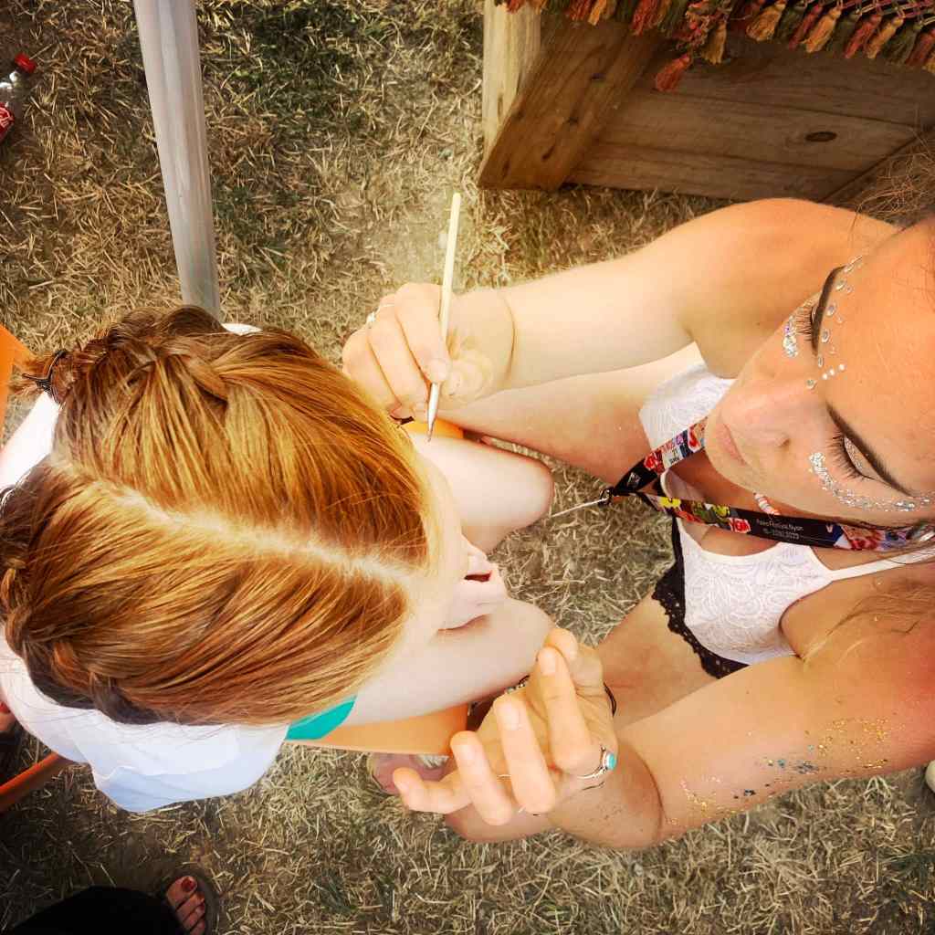 Water-based and oil-based body and face paints are vegan, hypoallergenic, and cruelty-free. Water-friendly glitters are available. Temporary butterfly and pirate tattoos are also available.